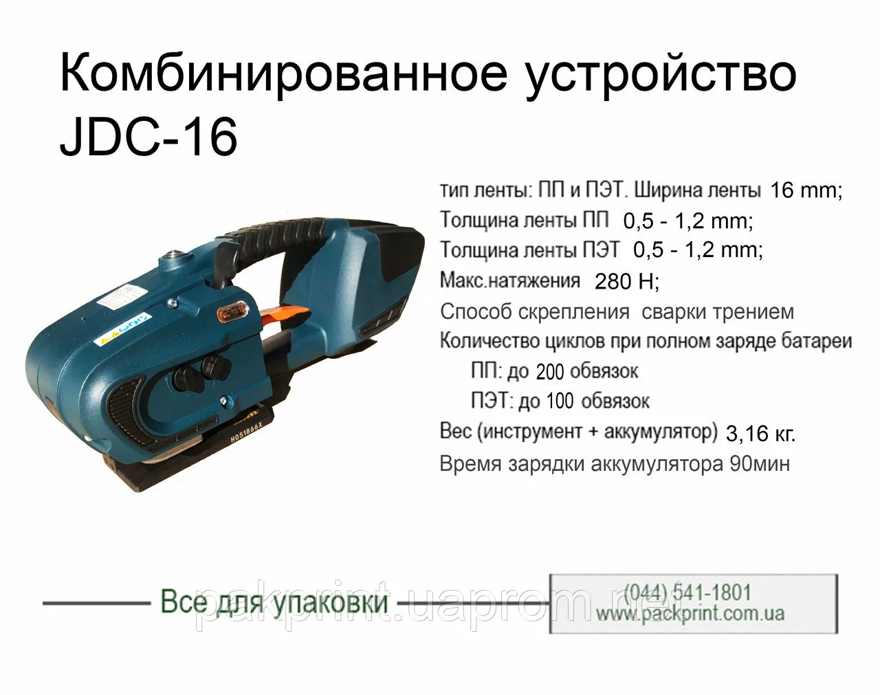 Аккумуляторный стреппинг инструмент JDC 16 - мощный промышленный стреппинг - инструмент для натяжения и скрепления упаковочных ПП(полипропиленовых) и ПЭТ(полиэстеровых) лент с питанием от аккумулятора. Работает в любом положении. Широко используется в различных отраслях промышленности (бумажной, табачной, деревообрабатывающей, химической, металлургической).
