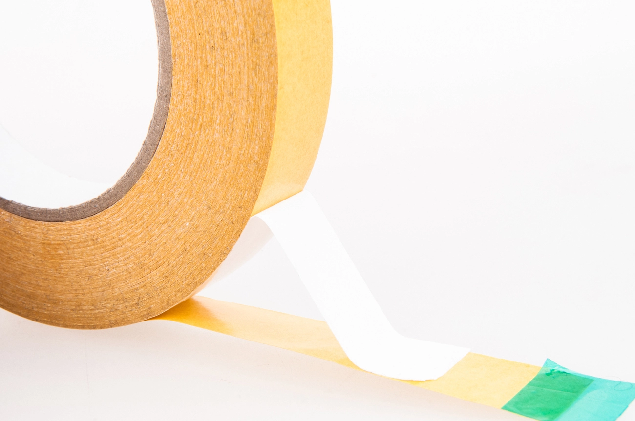 Клейкая лента двухсторонняя артикул 4145 на полипрпиленовой основе белого цвета имеет желтый лайнер из силиконизированной бумаги, клей белый синтетический каучук .
