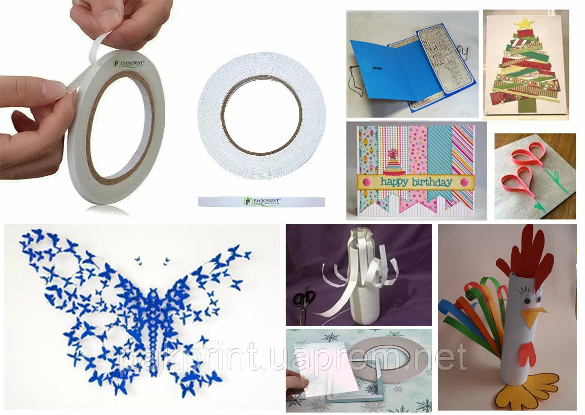 Назначение тонкой клеевой безосновной ленты – это поклейка легких бумажных или картонных конструкций (муляжи, флажки, плакаты, постеры, бумажные пакеты, конверты, папки без УФ - лака и ламинации), сборка коробочек, конвертов, сращивание бумажных рулонов в бумажно - целлюлозной промышленности, вклейка окошек в конверты и образцов, временная фиксация тканей и кожи, а также другие варианты работ. Часто бумажный двусторонний скотч используют при производстве фото книг или вклеивание фотографий.